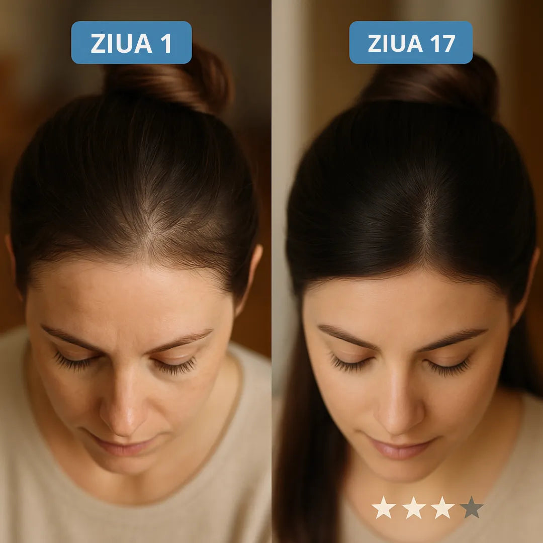 • "Când am citit că conține Redensyl și Aminexil, am știut că nu este o înșelătorie. Într-o lună, linia mea era vizibil mai deasă — fără să schimb nimic în rutina mea."